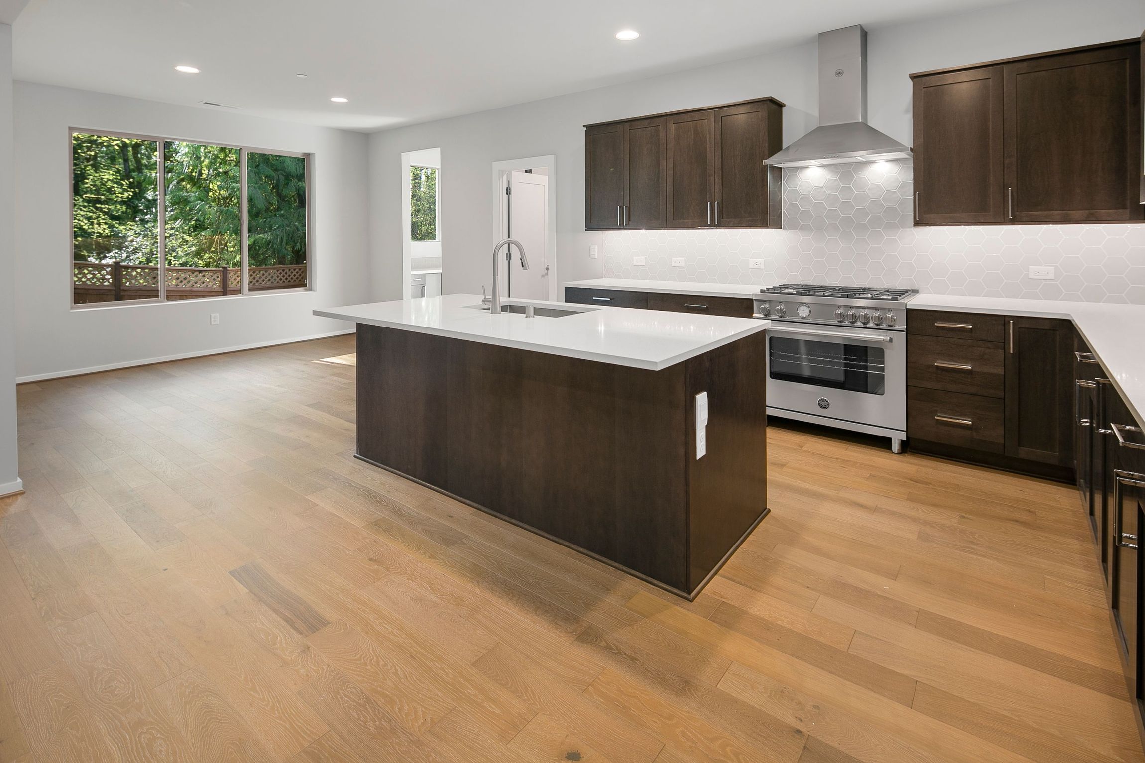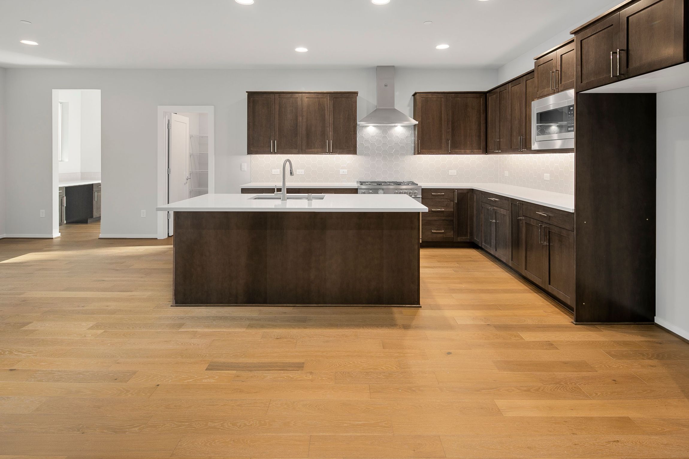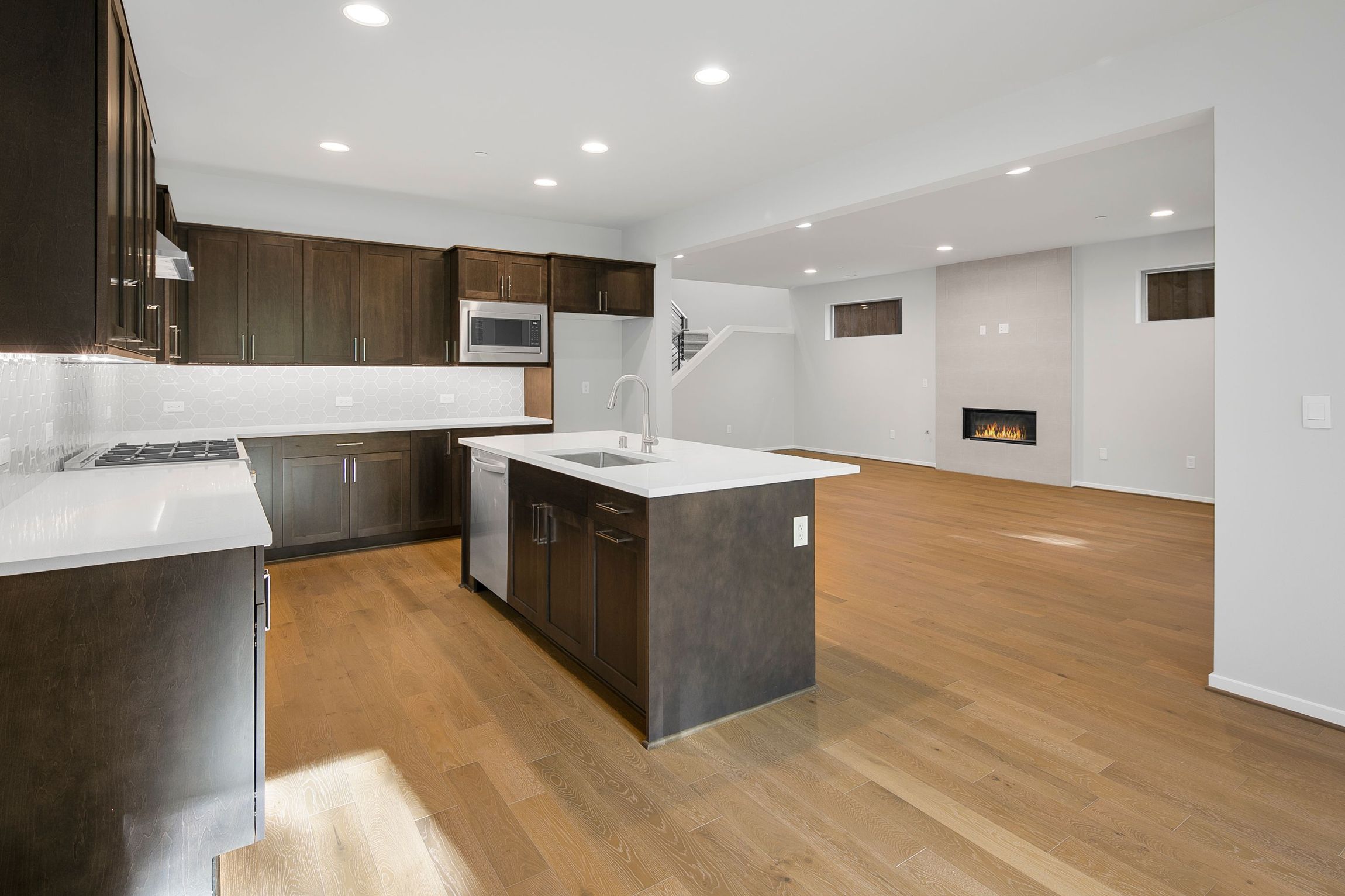 This impressive 3,476 sq ft, two-story home offers 5 bedrooms and 3.25 bathrooms, combining elegance with functional living. The main floor greets you with hardwood floors, a powder room, and a guest suite with a 3/4 bathroom, perfect for visitors or multi-gen living. The open layout includes a spacious contemporary kitchen with a 5-burner gas range, quartz counters, and a large walk-in pantry. It flows seamlessly into the great room with a stunning fireplace. A pocket office with a built-in desk is next to the dining area that leads to a covered patio where you can enjoy indoor-outdoor living.