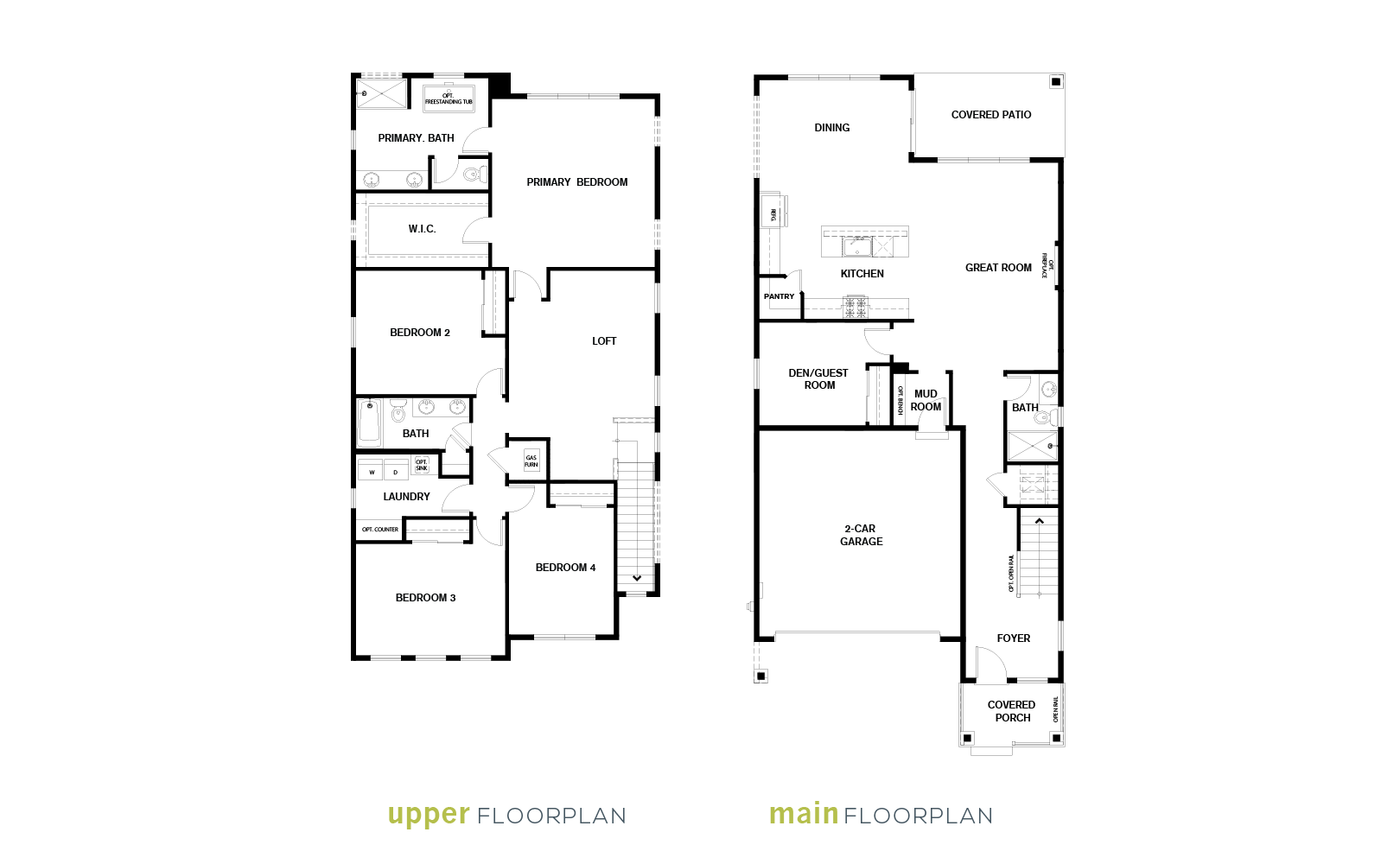 The Finch plan is a 2,726 sq.f.t, two-story home offering 5 bedrooms and 2.75 bathrooms, designed for versatile living. Enter this spacious home by a covered porch and welcoming entry to find a den/guest room with a 3/4 bathroom, making it perfect for guests or a home office. The open-concept design includes a great room with an option of adding a contemporary fireplace, a kitchen with a pantry, and a dining area that leads to a covered patio – ideal for indoor-outdoor entertaining. A mudroom with an optional bench provides additional convenience.