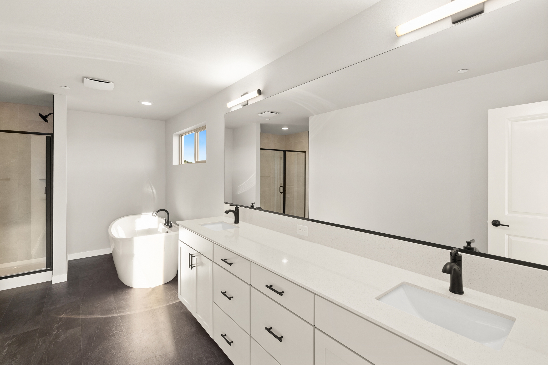 The second floor of the Hawk plan features an open bonus area and four bedrooms, a full bathroom, and a laundry room that can be customized with a sink. The primary suite includes a large walk-in closet and an ensuite bathroom with a walk-in shower, with an option to add a freestanding tub for a luxurious retreat.