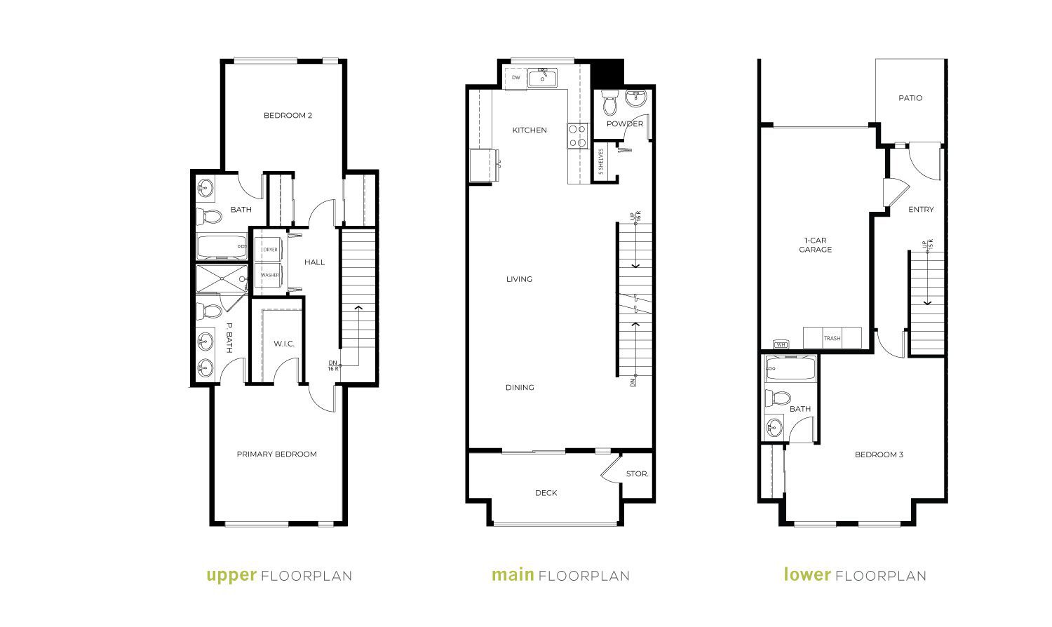 The Cedar offers a flexible three-bedroom layout designed for today’s lifestyles. The main floor showcases an open great room, dining, and kitchen area with easy access to a private deck, perfect for gathering or relaxing at home. A powder room adds convenience for guests.