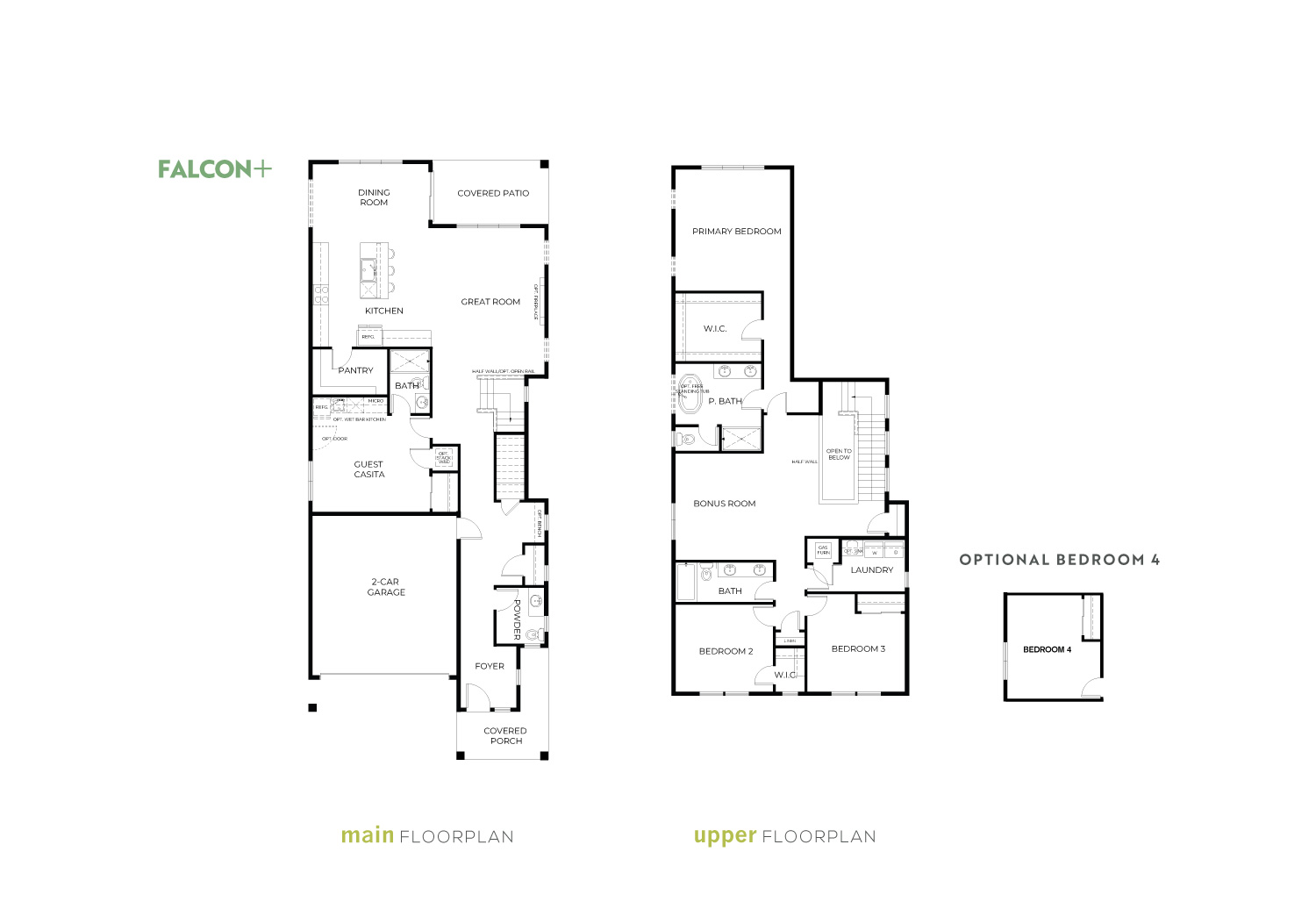 The upper level includes 2 bedrooms plus the primary suite, a secondary bath, and a convenient laundry room. There’s also a large bonus room, with an option to divide it into a 4th upper level bedroom, offering even more versatility. The primary suite comes complete with a walk-in closet and an ensuite bath featuring a walk-in shower. For added luxury, you can add a luxurious freestanding tub. Visit the Falcon model home and see for yourself how it makes a statement!