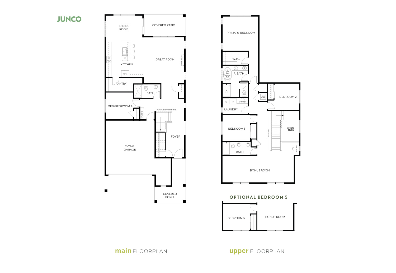 The Junco plan is a 2,587 sq ft, two-story home featuring up to 5 bedrooms and 2.75 bathrooms, designed to offer both flexibility and comfort. The main floor starts with a large, covered porch and a welcoming foyer that leads into a great room filled with natural light, thanks to Conner Homes’ signature oversized windows. You’ll love the 12-foot ceiling in the living area and you can add a cozy fireplace to make a bold statement. The contemporary kitchen has a large walk-in pantry with a convenient outlet, ideal for an additional mini fridge. The dining area flows seamlessly to a covered patio, for indoor-outdoor enjoyment. Need a main floor bedroom or den? The Junco has one with a 3/4 bath, perfect for guests or as a home office. Finally, the garage has a unique area for extra storage and can also be used as a workshop.