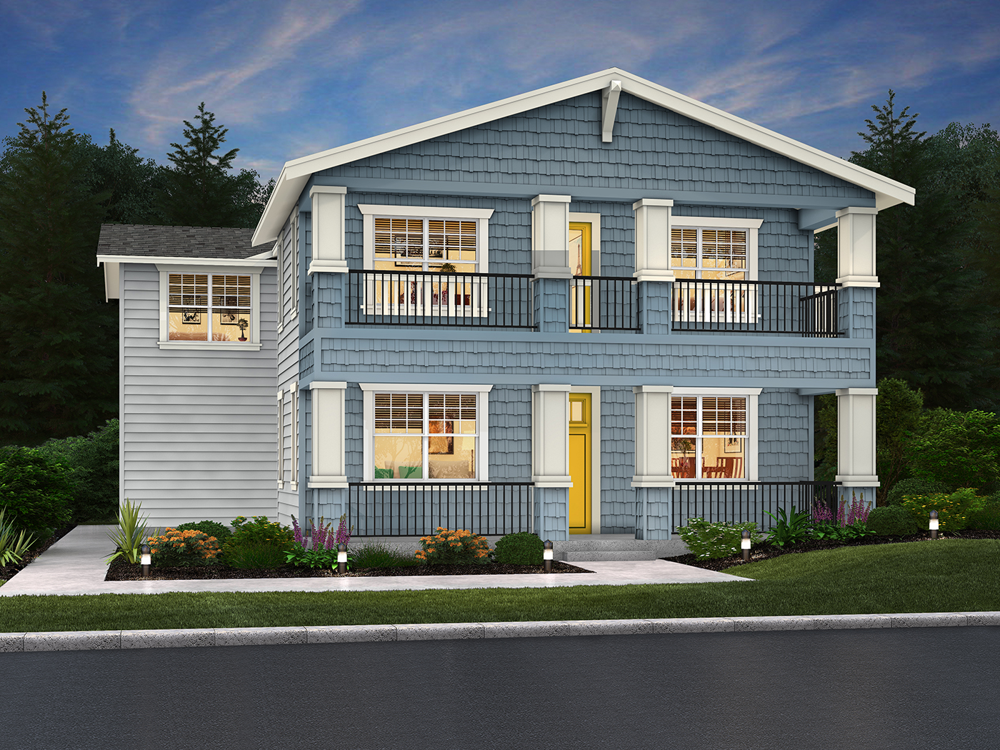 Upstairs, you’ll find a bedroom and bath, along with a built-in desk for added convenience. The attached two-car garage adds practicality to this level. The upper floor features four additional bedrooms, including the primary suite with a walk-in closet, a versatile exercise area, and an ensuite bath with dual sinks and a soaking tub. An upper-floor bonus room, laundry, and built-in storage enhance the layout. You can personalize this home with your choice of four elevations, with two options offering a covered deck on the upper level.
