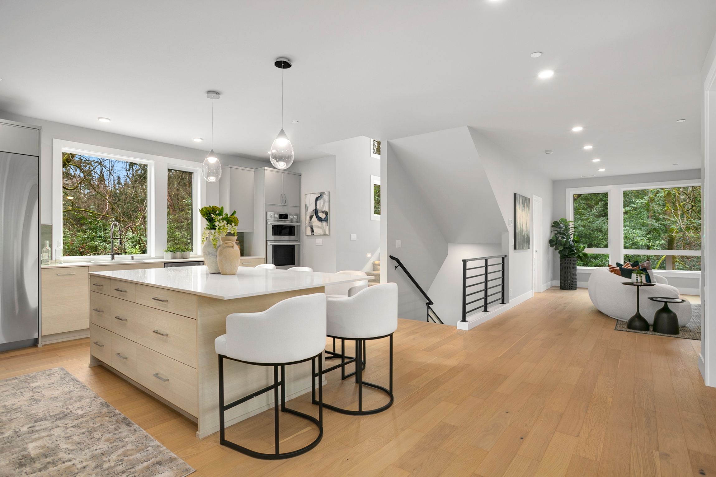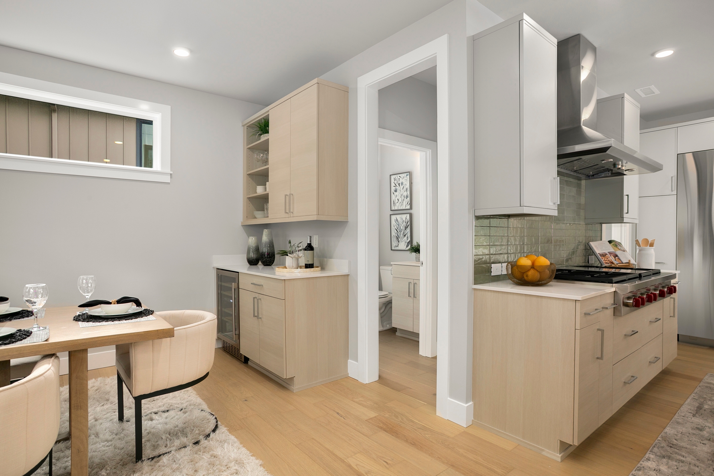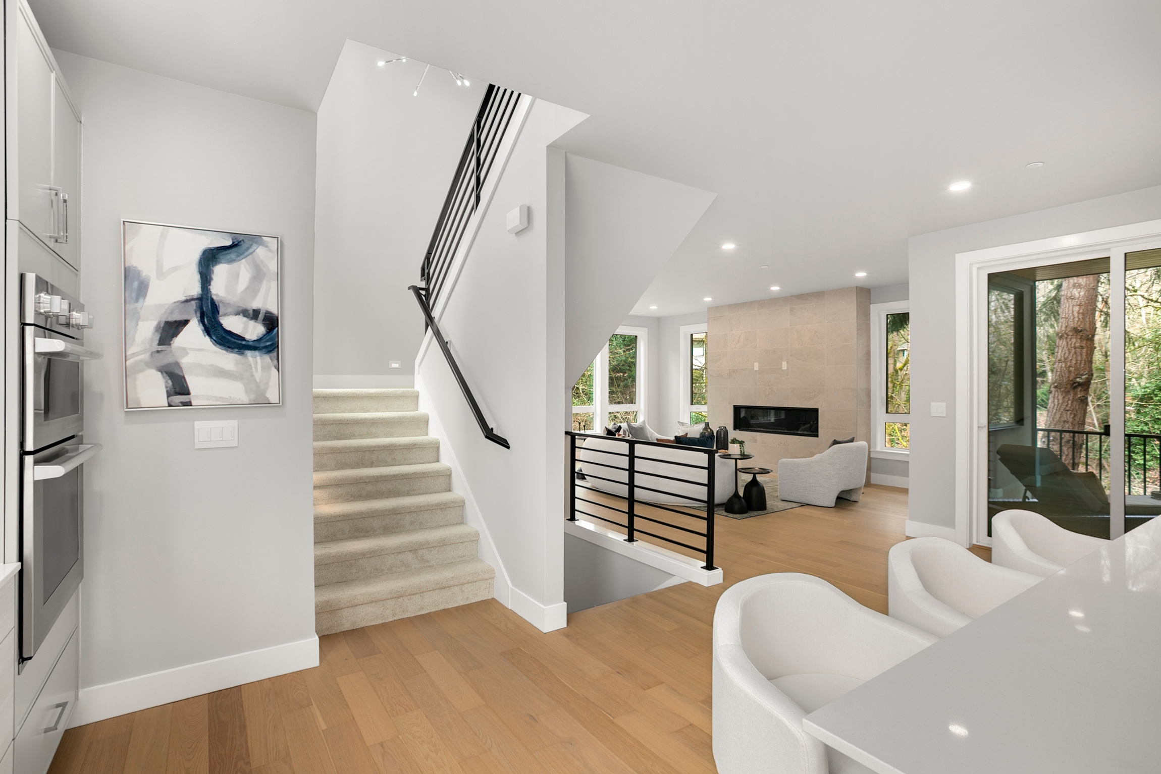 The main floor is designed for both gathering and everyday living. Engineered hardwood floors lead you through a spacious great room anchored by a full-height tiled fireplace. The gourmet kitchen, outfitted with luxury SKS and Wolf appliances chosen by local Chef John Howie, is the heart of the home. A covered and heated deck extends the living space outdoors, while a powder room and a cozy pocket office with a barn-style door provide flexibility and privacy.