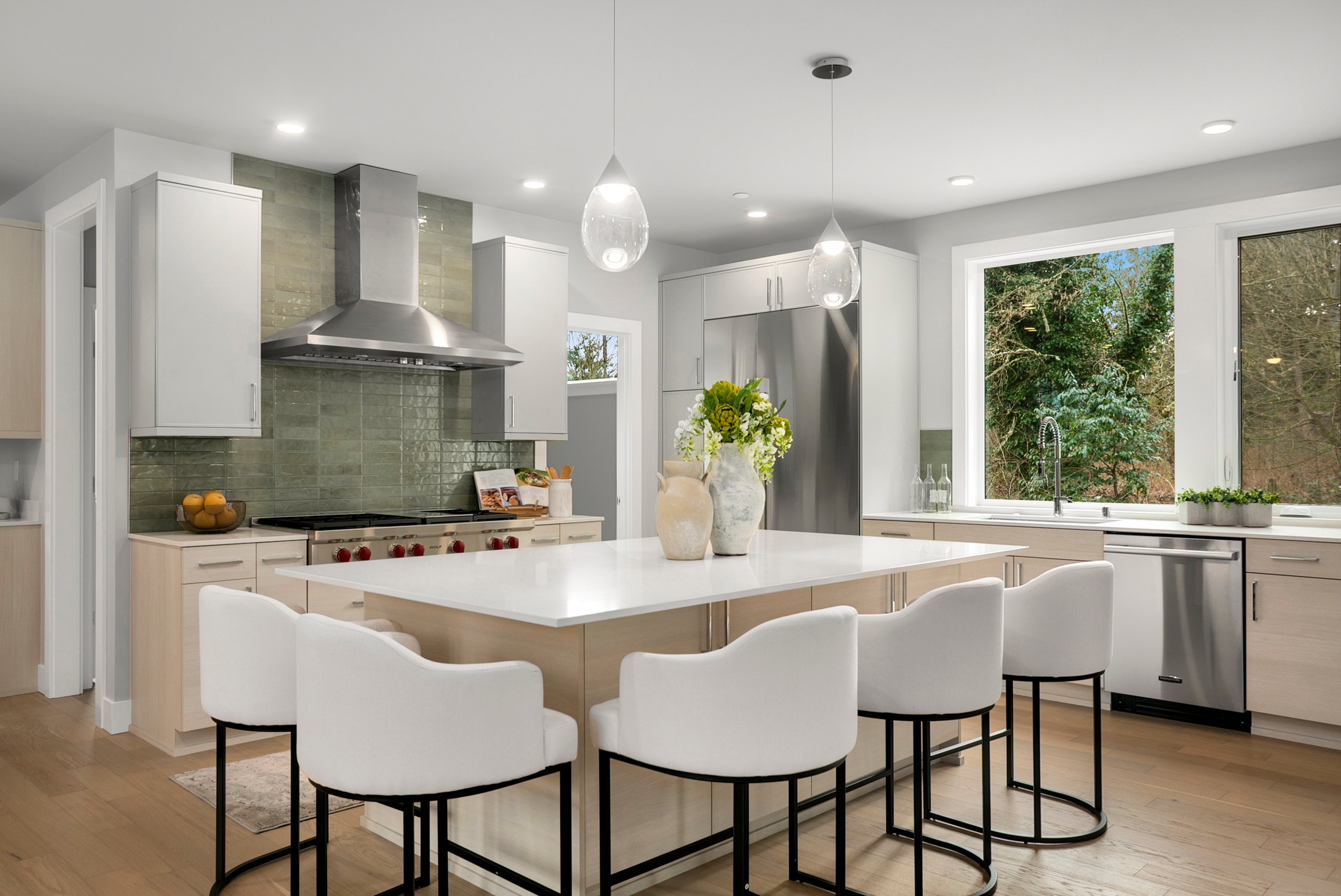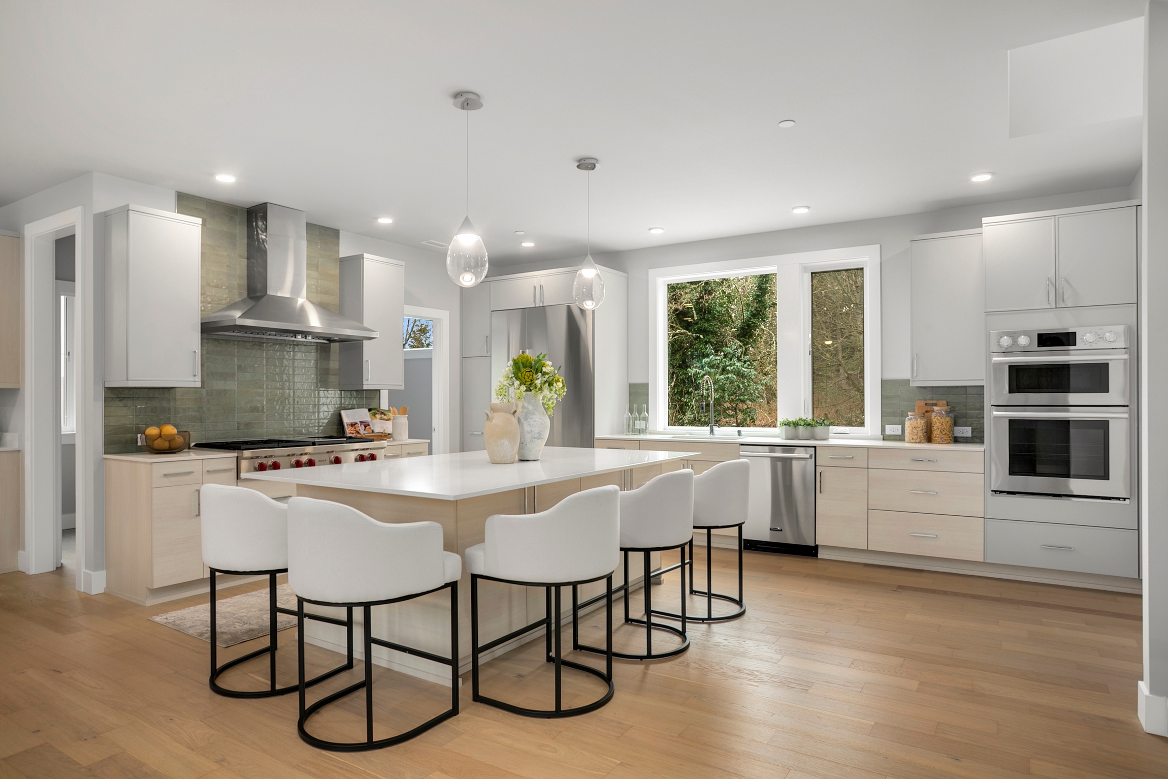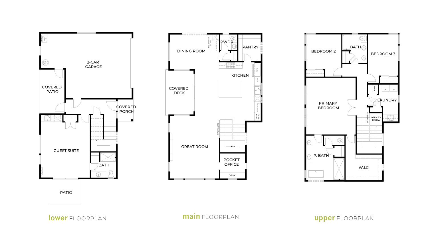 The main floor is designed for both gathering and everyday living. Engineered hardwood floors lead you through a spacious great room anchored by a full-height tiled fireplace. The gourmet kitchen, outfitted with luxury SKS and Wolf appliances chosen by local Chef John Howie, is the heart of the home. A covered and heated deck extends the living space outdoors, while a powder room and a cozy pocket office with a barn-style door provide flexibility and privacy.